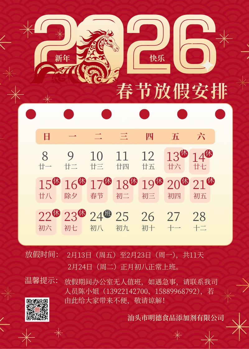 您好!新春將至,謹(jǐn)代表我司全體同仁,預(yù)祝您新春愉快、萬(wàn)事順?biāo)臁?br />感謝您長(zhǎng)期以來(lái)的支持與信任,F(xiàn)有一則關(guān)于春節(jié)物流安排的重要通知,敬請(qǐng)您知悉,以便提前做好生產(chǎn)安排。