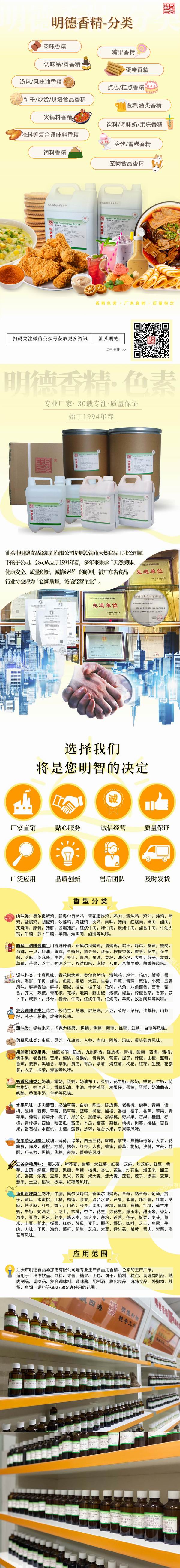 適用于調(diào)味品、肉制品、調(diào)味料、火鍋調(diào)味料、外撒粉、復(fù)合調(diào)味料、膨化食品、麻辣制品、罐頭、休閑小食品等GB2760允許添加食品用香精的食品。