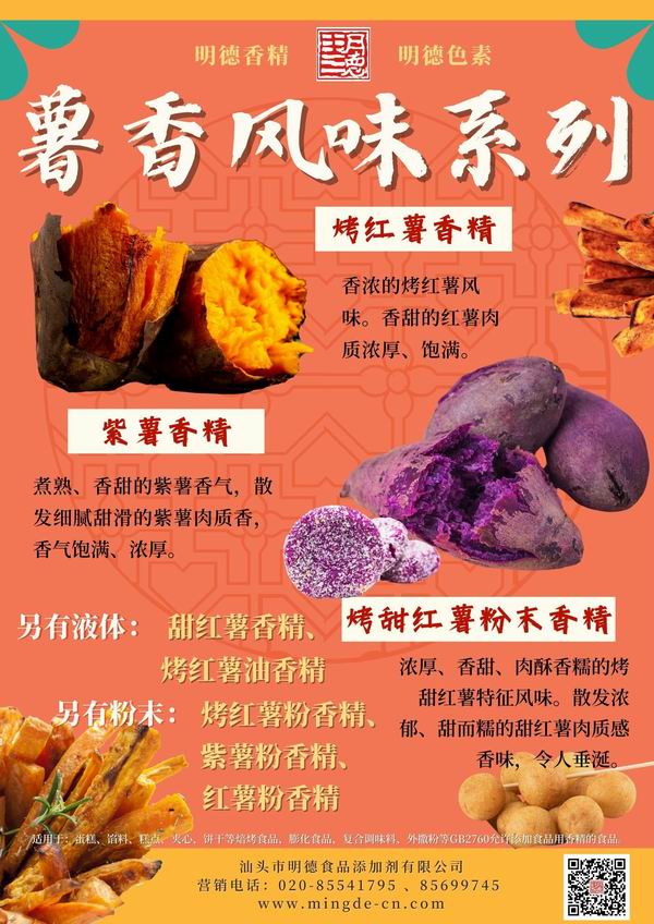 在薯味香精領(lǐng)域我們數(shù)十年潛心專(zhuān)研,迎合市場(chǎng)需求,滿足消費(fèi)者喜好,汕頭市明德食品添加劑有限公司,推出了多種風(fēng)味的番薯風(fēng)味香精,如:紫薯香精、紅薯香精、烤紫薯香精、烤紅薯香精、甜紅薯香精等。